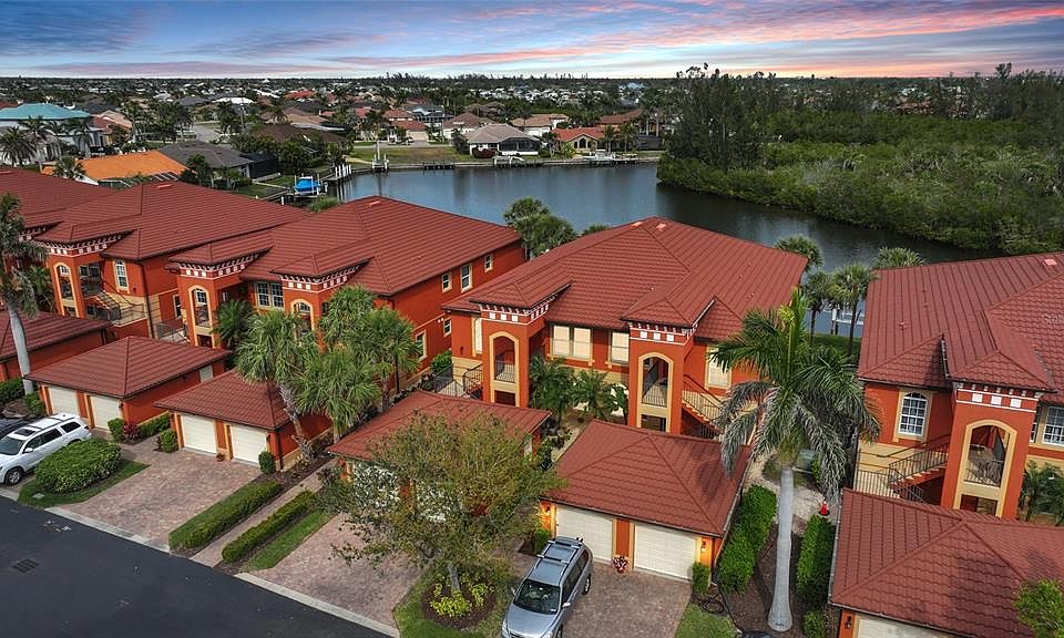 FIRST FLOOR, WATERFRONT condo with GORGEOUS SUNSETS on a WIDE CANAL. Your DOCK & Remote Controlled 10,000 lb BOAT LIFT (#26) is directly in front of your lanai!!! Welcome to this beautifully maintained, 3-bedroom, 2-bathroom unit at Mondovi Bay Villas in Burnt Store Isles. This END UNIT provides ample light to the interior. The master bedroom has 2 walk-in closets, and the primary guest suite has a walk-in closet. Additionally, the guest suite can double as a 2nd master by utilizing the pocket door to close off the quarters. The UPDATED KITCHEN has solid wood cabinets, Corian counters and a tile backsplash, an island prep area, closet pantry with plenty of room to cook and entertain! Your new condo boasts 1596 SQUARE FEET OF LIVING SPACE plus a 1 CAR GARAGE with attic storage. Updates within the last 4 years include a STEEL COATED ROOF in 2023, HURRICANE IMPACT WINDOWS AND DOORS, washer & dryer. A/C and refrigerator are 5 years old. Other features include a paver driveway, WIDE BASIN VIEWS, NO BRIDGES, and your boat sits directly behind your condo. The dock has water & power. The Association maintains dock, pilings & electricity, you maintain the lift. The Association fee includes water, sewer, exterior pest control, grounds maintenance, basic cable, dock maintenance & a strong financial balance sheet. Community features include a HEATED POOL & SPA, Cabanas with BBQ Grills for your use and a vibrant social activity scene. Golfing is available a couple of minutes away at Twin Isles Country Club. Your new home is 1.5 miles from the City of Punta Gorda where you can enjoy many local restaurants, live music, arts & crafts festivals, biking and walking pathways, Charlotte Harbor, parks. Fishermen's Village & 2 farmer's markets. Several GULF BEACHES are approximately 45 minutes away and private islands are a boat ride away. No water intrusion from the recent storms here. This HIGHLY DESIRABLE FIRST FLOOR unit is sure to go fast. Make an appointment for your private showing today!! (VIRTUAL TOUR ATTACHED)