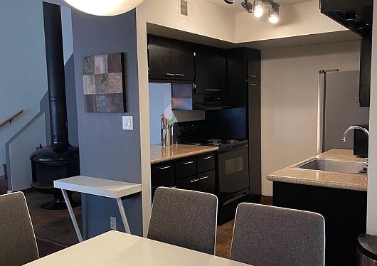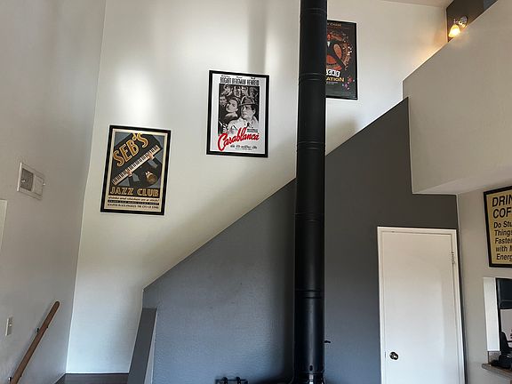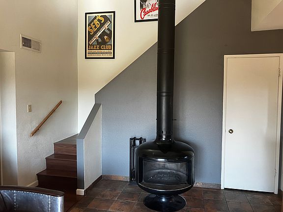 Potbelly fireplaceCorner unitHigh ceilingsLoft bedroomCovered parking spaceRemodeled bathroomNew windows