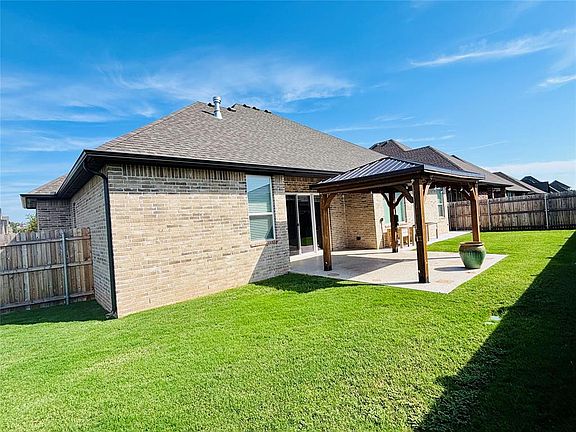 NOTE: The home offers a 4th bedroom on the front of the home which is the largest of the secondary bedrooms with ceiling fan and full closet. Currently used as a study with no door offering flexibility for the needs of the new owner and making it the only 4 bedroom home under $500,000 in the community at time of listing. The home has extensive upgrades and improvements inside and out including central vac system, a tankless hot water system, full guttering, extended driveway, and energy-efficient construction. With 10 ft ceilings throughout, the open plan features a beautiful living area with a tray ceiling and beautiful beams, a gas log fireplace and lots of natural light. It opens to a beautiful yard with a covered patio with a natural gas grill hook up and custom covered pergola (10 x 14) with lights, fan and shades. On the south boundary the property offers a custom, painted privacy fence, large fully sprinkled grassy area and additional sidewalks that were added. The gourmet kitchen boasts Frigidaire Gallery appliances with 5-burner gas cooktop and double ovens with a large walk-in pantry. The primary is separate from the other bedrooms and has a beautiful en-suite with shower, tub and double vanities. The 3-car garage has a built-in storm shelter and epoxy-coated floors and has MyQ smart garage door opener and access to a floored attic for storage. The hall bath offers double vanities, storage and a tub/shower combo and there is an additional half bath in the entryway for guests. This home is priced to sell and has been meticulously maintained. Call Scott today for your private tour or more information.