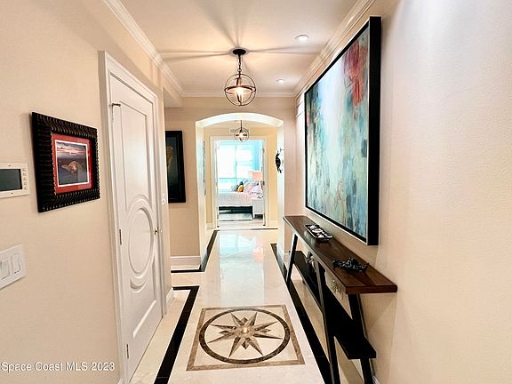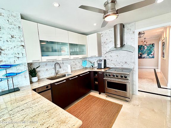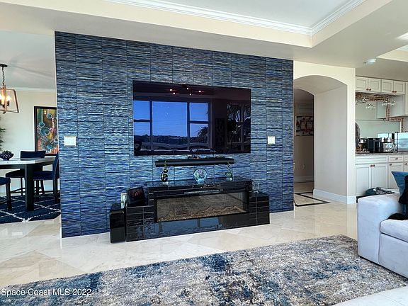 Villa Verde~3rd Floor! Exquisite & serene waterfront paradise-South Cocoa Beach! Completely redone in 2021 and fully furnished. This is a 3 Bedroom 3.5 Bath, Direct Riverfront condo on the 3rd floor, Southwest corner (Across the street from Ocean). Everywhere you look you will see panoramic views of the Banana River and the Atlantic Ocean through giant glass windows and glass railings on the 3 spacious balconies. 2 Garage spaces included. Interior Features include flawless marble & tile floors, all new Viking kitchen appliances, new kitchen wall tile, newly built-in wet bar w/sink and wine refrigerator in dining room, new accent wall w/ glass tile in family room & fireplace, incredible solid core interior doors, new light fixtures, new paint throughout, electric roll down window blind