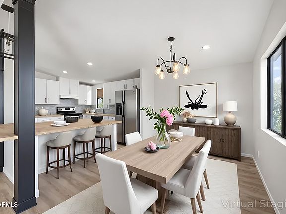 Step inside to a stunning modern farmhouse design featuring wide-open living spaces, rich wood-look flooring, and abundant natural light. The kitchen is a showstopper with its crisp white cabinetry, butcher-block style counters, subway tile backsplash, and striking black column accents with pendant lighting that frame the breakfast bar. The seamless flow into the spacious living and dining areas makes this home ideal for both everyday comfort and hosting friends.
