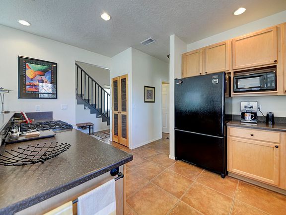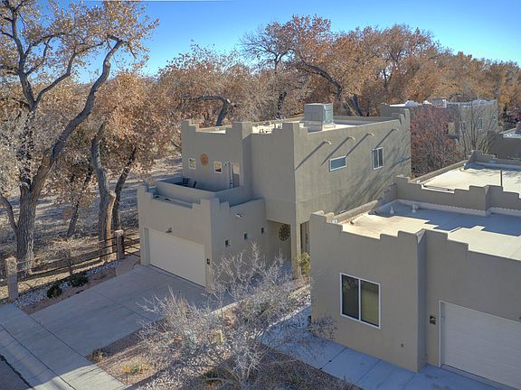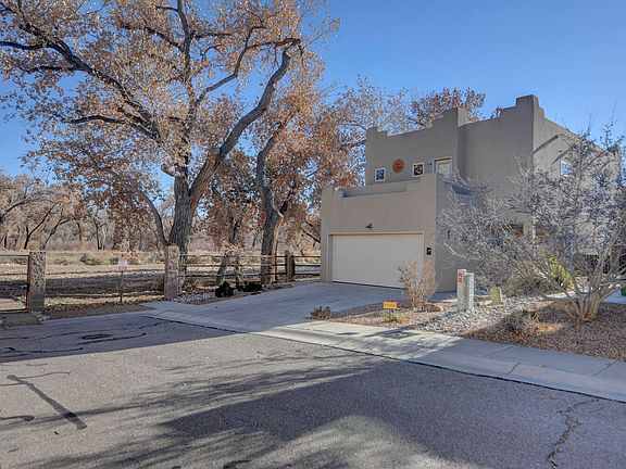 2 story stucco; 2 car garage attached; app 1786 sf; 3 bd or 2bd w/office; mstr suite w/ balcony; 2-1/2 baths (1/2 bath dnst); array large bosque view windows; bdrms feature views of river walk; priv back patio off dining area w/ NG for BBQ; home borders on a 2.5ac private gated common area; gated access to Bosque trail system; interior NG outlet for future KIVA/FP; hi-spd int wi-fi + RJ 45 connections; kitchen incl gas range, oven, microwave, dishwasher, RO water system (under sink), water softener is fully plumbed-in, system NIC; security system; Irrigation system; 44 unit subdivision: Las Casitas Del Rio.