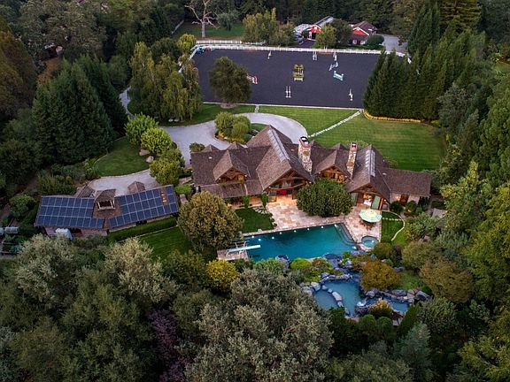 Spanning 5 acres in the heart of Silicon Valley, this private retreat was designed & built by R.J. Dailey w/inspiration from Austria's Hotel Zur Tenne. Masterfully crafted hand-carved reclaimed wood & hand-forged iron details. First-cut antique stones from the floors of French castles in the living room extend out to the terraces for a seamless indoor/outdoor flow. The breathtaking setting is reminiscent of a resort with towering cliffs & waterfalls flowing into a pool with a competition Grade 1 meter diving board, one of only a few private residences in the country to have such a distinction. A teahouse is tucked away for meditation. Extensive organic vegetable gardens & orchards. World class equestrian facilities w/2 barns, zoning for 10 horses, grass pasture, year-round arena, automated horse-walker, & direct trail access. The estate is powered by solar panels & secured by backup generator. Woodside School. It is close to Stanford University, & two international airports.