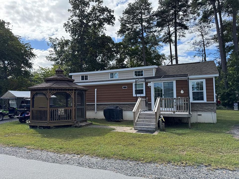 Beautiful well maintained park model on two lots in Trails End. One lot has the park model, gazebo and driveway. Second lot is mostly cleared with a carport and shed. (camper show in photo on second lot does not convey). Park model includes open living room/kitchen, bathroom, and bedroom. Upstairs has a dual loft. Great for extra sleeping or storage. Main door has a small deck for sitting and relaxing. Includes access to pool, dock, fishing pier, crabbing pier, boat ramp, boat slips, marina, clubhouse, playground, pavilion, and more.