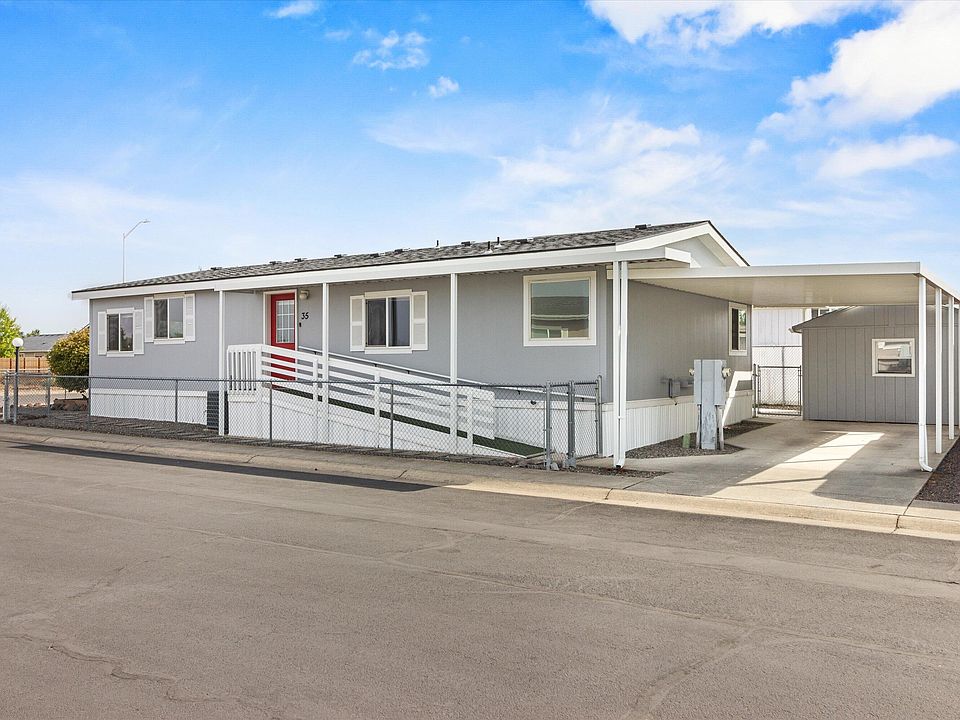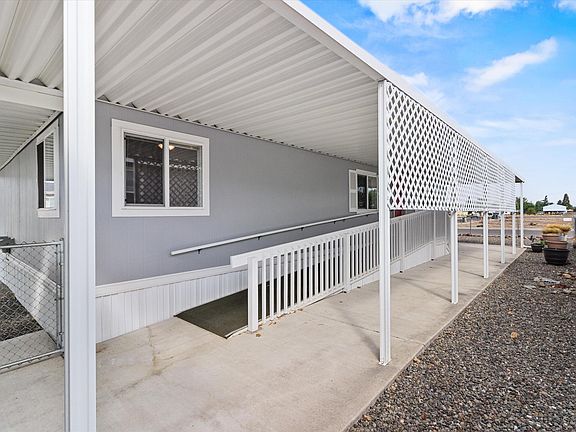Back on the market—no fault of the property! Designed for ease of living, this 2-bedroom, 2-bath, 1,296 sq. ft. home features accessible ramps, step-free entry, and wide walkways—ideal for long-term comfort without the expense or hassle of retrofitting, The kitchen offers warm wood cabinetry, a breakfast bar, and ample storage. Enjoy a spacious living room, versatile den/office, and a primary suite with walk-in shower and soaking tub. Vaulted ceilings add an open, airy feel. Recent updates within last six years include roof, exterior paint, microwave, refrigerator, and water heater, providing peace of mind and built-in savings. Outside offers a low-maintenance yard, covered patio, 12x12 shed, carport, and RV parking. Combining affordability, accessibility, and thoughtful updates, this home is a great option for 55+ buyers seeking comfort, convenience, and lasting value.