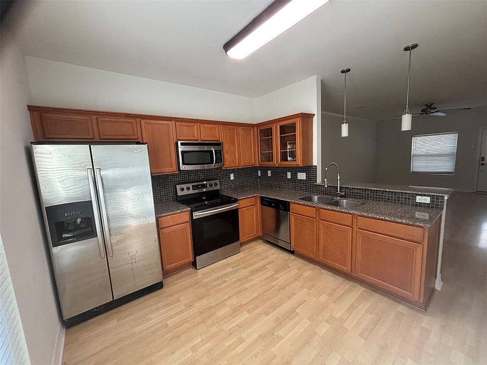 Stainless steel appliancesDining areaGranite countertopsOpen-concept kitchenMaple cabinetry