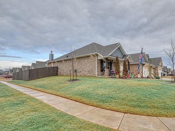 This BEAUTIFULLY maintained 4-bedroom, 2-bathroom home, located in THE WATERS neighborhood, offers 2,166 sq ft of functional living space with a modern OPEN CONCEPT ~ Spacious living room seamlessly flows into a chef's kitchen featuring STAINLESS STEEL APPLIANCES including a gas cooktop, a generously lit PANTRY, GORGEOUS custom-built glass front cabinets AND under-island storage offering seasonal organization ~ Primary bedroom suite boasts TWO walk-in closets, TWO vanities, and a FANTASTIC corner jacuzzi tub with AMPLE natural lighting ~ Enjoy cozy evenings by the gas fireplace inside or the wood-burning fireplace in the fully covered All Season Sunroom equipped with HVAC ~ FABULOUS EPOXY flooring on the front porch, back patio and in the oversized 3 car garage also featuring an inground storm shelter for added peace of mind ~ ADDITIONAL HIGHLIGHTS include custom landscape curbing, a PERGOLA in the backyard perfect for grilling ~ underground sprinkler system, custom cordless blinds, permanent DIGITAL CHRISTMAS lights and a RHEEM water softener complete the list of thoughtful upgrades. Built in 2022, this home is NEARLY NEW and is move-in-ready ~ The Waters neighborhood features a playground, multiple PONDS, and sidewalks ideal for walking the dogs, plus you’ll enjoy perfect CORNER LOT views from the large front porch! Conveniently located near I-35 and I-240, plenty of shopping, banks, churches, restaurants, schools and more ~ WELCOME HOME!