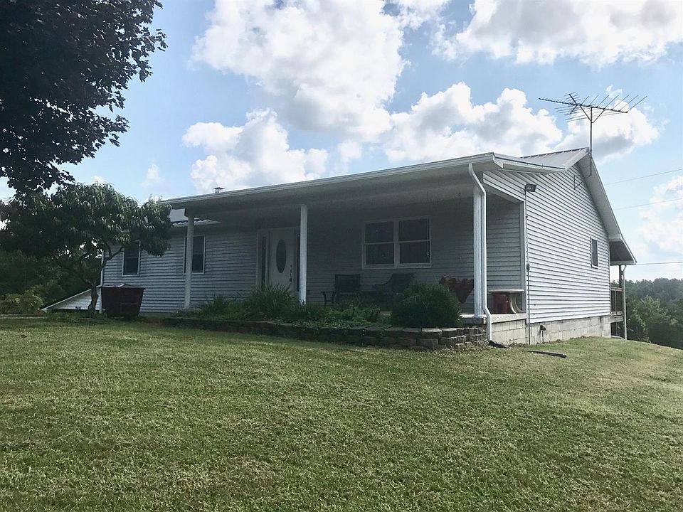 Darling country home with a rocking chair front porch on 10 acres. Plenty of privacy and views and peace and quiet. This 3 bedroom, 2 bath home features an open floorplan with hardwood floors and granite countertops and a gas range in the large eat-in kitchen. The walk-out basement is finished and offers plenty more living space and a possible 4th bedroom, along with a full bath. The utility room in the basement is huge and has plenty of room. The home is heated with a heat pump or outdoor wood burning furnace. There is a large detached garage and a carport. All kitchen appliances, wood stove, washer/dryer and deep freezer in the basement stay.