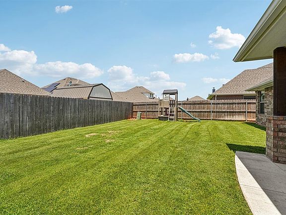 Welcome to The Waters, one of the most sought-after communities in the metro. Situated on a spacious corner lot, this beautiful home features 4 bedrooms, 3 full bathrooms, and a large upstairs bonus room with endless possibilities. It's ideal for a playroom, guest suite, or home theater. Inside, you'll find soaring ceilings, an open concept layout, and abundant natural light throughout. The living room boasts a coffered ceiling and flows seamlessly into the spacious dining area and chef’s kitchen. Highlights include a large island, walk-in pantry, and ample cabinetry, making it perfect for entertaining or everyday living. The split floor plan offers privacy, with a barn door separating the secondary bedrooms. The master suite is a relaxing retreat with vaulted ceilings, a jetted soaking tub, dual vanities, a designated vanity area, and a huge walk-in closet. Upstairs, the bonus room includes its own full bathroom, offering flexible space to fit your needs. The 3-car garage includes a storm shelter for peace of mind. Located with quick access to Tinker AFB, OU, Downtown OKC, major highways, shopping, and dining, this home truly has it all. Schedule your private showing today!