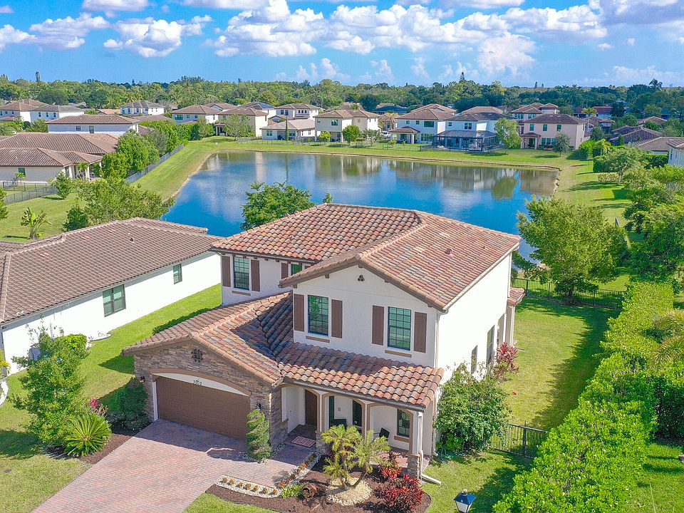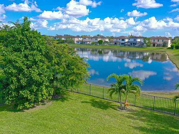 WATER, WATER EVERYWHERE- experience lake views from nearly every room in this bright contemporary Bellasera home!As you arrive, you are greeted by freshly manicured landscaping & a welcoming front porch overlooking the lake , with another lake behind the home for the ultimate privacy & serenity. The fully fenced backyard is enormous, offering plenty of room to design your dream pool while maintaining abundant green space for your four-legged friends to play. Mature Clusia hedges create a natural privacy wall, beautifully framing the water views. An impressive 12' x 40' brick paver patio provides the perfect space for alfresco dining & outdoor entertainment. Built in 2020, this home features a newer roof and full-impact glass for total peace of mind, along with lower insurance rates. Step inside a ZEN-LIKE living room (can be a dining room) with a custom decorative accent wall and peaceful front lake views. The open kitchen flows seamlessly into the spacious family room, highlighting an abundance of glass that brings the outdoors in, filling the home with natural light and vibrant energy. The kitchen design is right on trend with white shaker cabinetry, cabinet crown molding, a 24" cabinet above the refrigerator, quartz countertops, an exotic marble backsplash, reverse osmosis dispenser, and stainless-steel appliances. A counter-height island with a rich contrasting wood and contemporary lighting complete this bright, cheerful South Florida living space. A large walk-in pantry tucked under the staircase adds incredible storage and convenience.