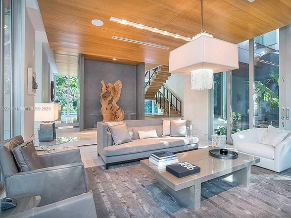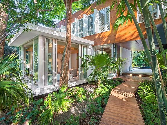 Hammock House, a spectacular tropical modern-style home in the gated & historic bayfront community of Camp Biscayne. A state-of-the-art residence w/walls of glass that create a seamless blending of interior & exterior spaces. The home offers the ultimate in privacy & is surrounded by lush tropical landscaping amid a forest of mature oak & mahogany trees. The main house features a stunning Boffi kitchen, a large modern office, staff quarters + 4 ensuite BR's, including a lavish master suite w/spa-like bathroom featuring a glass-enclosed rain shower, soaking tub & sauna. Additional notable features include a 1/1 guest house and a serene outdoor oasis w/ heated pool, Jacuzzi & summer kitchen. Just steps from the Grove village's galleries, boutiques, cafes and bayfront parks & marinas.