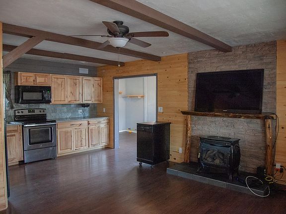Great cabin on a large cud-a-sac lot! This charming 2 bdr, 1 bath has an additional breakfast room or den. Freestanding propane stove in LR, propane wall heater in addition and electric fireplace in bedroom make it ideal for year-round use. Open kitchen and T&G through-out for that cabin look and feel. Outside offers a metal roof, large covered front deck, vinyl fencing in front, 6' chain link fence in the back for the kids and pets, drive through gate, large shed, circular drive and is located on a county maintained road for easy year round access. Come take a look and make it yours.