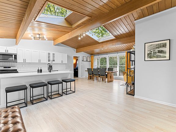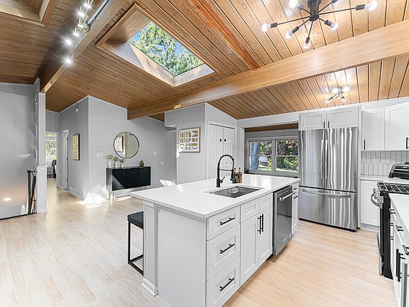 Full finished basementHuge islandClerestory windowsQuartz countertopsDramatic vaulted wood ceilingsWine refrigerator