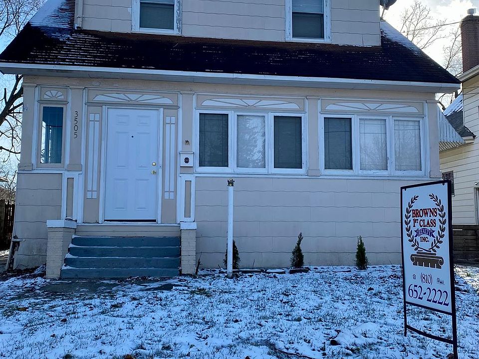 3 Bedroom, 1.5 bathrooms with over 1,150 sq ft of living space. Features a large front porch with roll out glass windows and all new blinds. Full Basement with lots of storage area. Force air gas furnace & central air. Small deck on back of house. Master Bedroom has large walk in closet. New stove, refrigerator, dishwasher and a large pantry. Home has been completely updated with new steel entry doors, vinyl plank flooring and carpet throughout, freshly painted with all new blinds. Updated copper pipes and new sewer lines by the city of flint in August 2023. 1 car detached garage with new door. Move in ready. A must see!