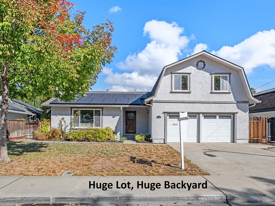*A spacious single-family home on a rare, sun-filled super large lot with huge backyard in prime Santa Clara offers exceptional potential, from expanding the existing residence to building multiple homes (buyer to verify). *Inside, you'll find a bright living room with a cozy fireplace, a large dining area that can also serve as an additional family room, and a functional kitchen with abundant cabinetry. The living spaces flow effortlessly through wide sliding glass doors into the massive backyard with fruit trees, perfect for outdoor gatherings and future possibilities. *The ideal floor plan includes one bedroom and one full bath on the main level, great for guests or multi-generational living. Upstairs features spacious, airy bedrooms with soaring ceilings, including one overlooking the serene backyard greenery. *Additional highlights include energy-efficient solar power, a 2-car side-by-side garage & in-house laundry. *Located in a quiet yet central Santa Clara neighborhood, this home offers quick access to Apple, Nvidia, Kaiser, parks, shops, & restaurants, and is served by Adrian Wilcox High School (rated 8/10 on GreatSchools). Disclaimer: Previous record showed 9,658 sq. ft. lot, while the current record shows 9,240 sq. ft. Buyer to verify.