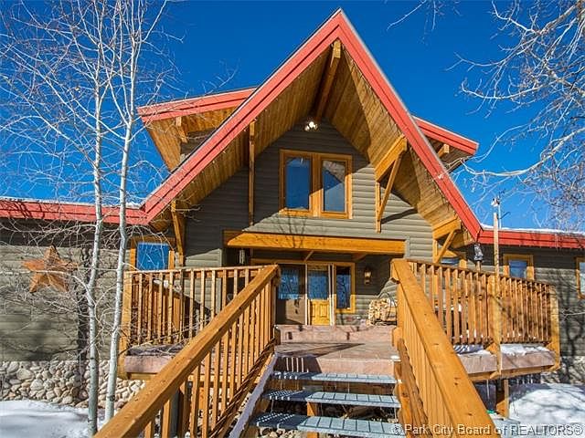 This custom luxury Lindal Cedar Home is located high atop the private gated & guarded community of Timber Lakes.1 hour from SLC airport & a quick 30 min drive to Park City, Deer Valley, & the Canyons Resorts. Enter the main level from the great south facing deck, to a very open floor plan w/white oak wood floors, dramatic open beam ceilings, stone fireplace, 2 bdrms including master w/french doors leading to the 2nd spacious cover deck, gourmet kitchen w/entertainers island,granite counters & wolf appliances.Above ground level family rm with plenty of windows letting in an abundance of natural light, slate floors, gas fireplace for xtra heat, huge storage, a separate wine room & mud room.The loft/office on the upper level is a wonderful area for guests, could be converted into a lrg bdrm and overlooks the living and ktchn area.Polar insulation, 500 gallon in line water storage, both electric & propane heated boiler, radiant in floor heat, central vac & dimmer switches through the home.