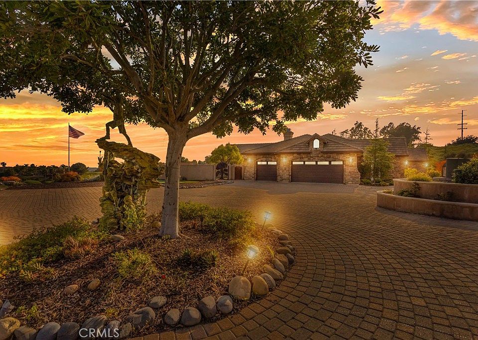 Welcome to 3505 Vista Laguna Rd., a Tuscan Hilltop Estate nestled on over 4 acres featuring unparalleled views of Sycamore Ranch, the hills of Bonsall, and distant mountains that truly captivate the senses. The ornate automatic gate and paver driveway adds to the grandeur of the property, providing ample space for parking and enhancing the overall curb appeal. This exceptional property features hand-applied plaster walls and ceilings, travertine flooring, elegant crown moulding, and a catering kitchen. The upgraded main kitchen has gorgeous solid hardwood cabinets, wine cooler, six burner range, two convection ovens, warming drawer, prep sink, new KitchenAid built-in microwave, hot water dispenser, and breakfast/bar seating, making it perfect for both everyday living and entertaining guests. The master bedroom suite is a peaceful sanctuary with its amazing views, fireplace, large cedar lined walk in closet, and relaxing jet tub. The secondary bedroom has its own private entrance, perfect for out-of-town guests. The 6 sets of Dual Pane French Doors not only provide natural light, but also seamlessly blend indoor and outdoor living spaces. The landscaped grounds with gated entry, artificial turf, and terraced gardens add to the property's allure. With energy-saving features including solar panels, Quiet Cool whole house fans, and smart home technology, and new self-cleaning hot water heater, this estate offers both luxury and sustainability. Additional indoor storage is available in the two attics with pull down stair access and walk-around capability. The 3-car garage has professional grade epoxy flooring, with belt driven garage door openers with keypad and remote entry, with work sink. There is a 28’x28’ Outbuilding, perfect for a workshop, toys, cars, and/or tractor, with two 10’ x 12’ Tuff sheds for your additional storage needs. The grounds offer plenty of space for a pool or expansion plans. The addition of mature citrus trees adds another layer of charm and enjoyment to the property. This is truly a dream home for anyone seeking luxury living with breathtaking views. Close to wineries, golf courses, freeways, parks, and schools.