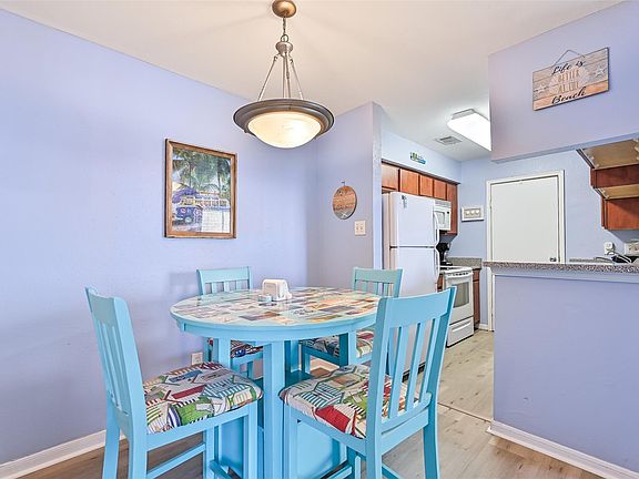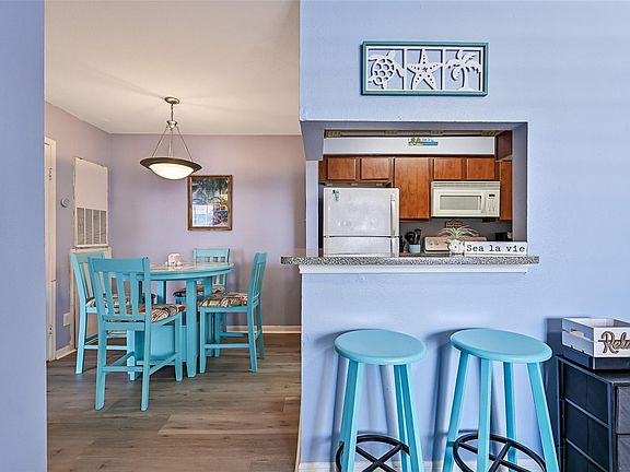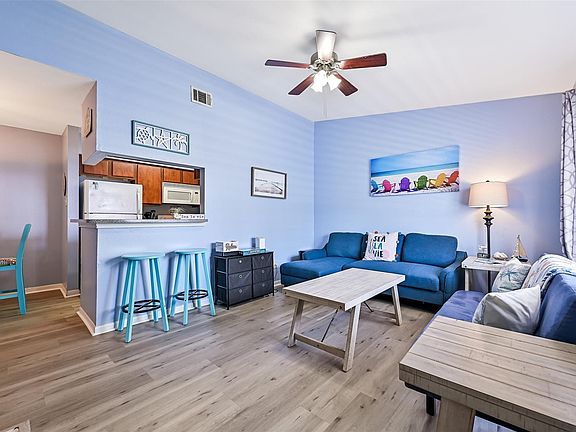 Walk to the beach from "Sea La Vie", a COMPLETELY FURNISHED condo at popular Palms at Cove View Condos just minutes from fabulous restaurants, shopping, Moody Gardens, the Strand, & cruise ships! Condos like this one don't come up for lease often, so here is your opportunity! This spacious floor plan offers easy-cleanup vinyl plank flooring throughout- no carpet. Open entertaining areas. The kitchen showcases a full suite of appliances, plates, pots, pans - all included! Full-size washer/dryer. Spacious primary bedroom offers bathroom access with separate vanity area, & an expansive walk-in closet. Second bedroom features a king size bed. Enjoy complex amenities to include the recently-renovated pool, sun deck, fitness center, newly-refreshed bbq area, & clubhouse. Famous West End Galveston bird-watching also just minutes away from this coveted location. Just bring your packed bags & tooth brush to enjoy your slice of ISLAND TIME without the upkeep & HOA fees! Schedule your tour today.