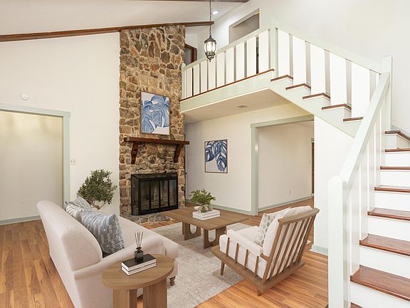 Step inside to a stunning vaulted living room with exposed beams, a dramatic floor-to-ceiling stone fireplace, and a custom-built reading nook under diamond-pane windows that flood the space with natural light. The beautifully new LVP flooring throughout, fresh paint, and updated lighting elevate every room.