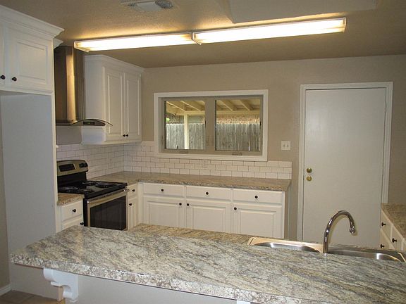 RainTree Updated by Steve Hill Homes with creative floorplan, covered side yard patio, fenced backyard. Updates include new interior paint, new carpet, vinyl plank wood floors, tile floors, new white kitchen cabinets, new appliances, some new windows, and new formica countertops. Open kitchen to dining area with skylight, large living room with built-in cabinets, hallway with laundry and built-in cabinets, bedroom with desk, jack and jill with sink in each bedroom, and more.