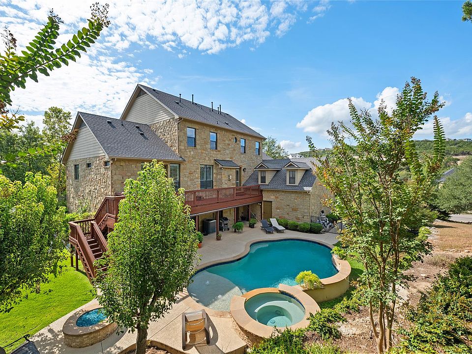 Experience Hill Country living in this expansive 3-story residence, offering over 5,800 square feet of thoughtfully designed space in the sought-after Crystal Falls community. With 6 bedrooms, 4.5 bathrooms, and multiple living areas, this home is built to accommodate both everyday living and large-scale entertaining. The main level features a gourmet kitchen equipped with double ovens, a center island, peninsula seating, a built-in desk with storage, and over-and-under cabinet lighting. The adjoining breakfast area, formal dining room, and living room with a gas log fireplace provide warm and inviting spaces to gather. The primary suite, also on the main level, includes a spacious sitting area, a walk-in closet, and a spa-inspired bath with jetted soaking tub and separate shower. Both the living room and primary suite open to a balcony overlooking the backyard and pool. An office with built-ins and a powder bath completes the main floor. The upper level offers four additional bedrooms, all with walk-in closets and plantation shutters, along with Hill Country views. The lower level is designed for recreation, highlighted by a dedicated theater with projection system and surround sound, plus three versatile game areas and a private guest bedroom. Outdoors, a sparkling heated pool and lush landscaping create a private retreat for relaxation or entertaining. The oversized 3-car garage offers additional storage and parking flexibility. Set on a generous homesite with elevated views, this home combines traditional design details with versatile spaces for work, play, and entertaining. Crystal Falls residents enjoy access to premier community amenities, including pools, parks, trails, golf, and more—all within highly rated Leander ISD.
