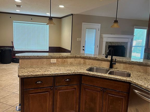 Large living area with fireplace , cabinets, plenty of windows, Fenced back yard with patio. Two car garage, front yard features large trees.