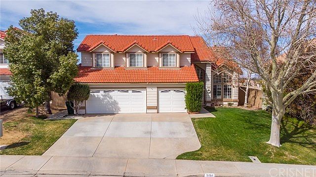 What a stunning home complete with ambiance, dramatic windows, warm colors, beautiful draperies, faux wood shutters and newer flooring. The formal dining room is adjacent to the spacious kitchen with breakfast area and overlooks a beautiful city and mountain view. The family room is open to the kitchen and offers a cozy fireplace and cathedral ceilings. Both the formal living room and family room have an abundance of space. All bedrooms have fans and mirrored closet doors and the master includes another cozy fireplace and double door entry. Enjoy a sunken tub and separate shower in the master bath with those same beautiful mountain and city views. Outside a covered pergola lends a beautiful living space to enjoy the city lights along side the fire pit. This home is in a very desirable west Palmdale neighborhood on a cul de sac.