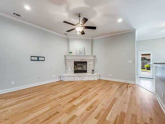 Discover the perfect blend of comfort and convenience in this 2018 built, North facing 3 bedroom, 2 bath home. Conveniently located near Sherman High School, this home is meticulously maintained and feels barely lived in. Enjoy front porch relaxation that epitomizes Southern hospitality. Step inside and experience the warmth of the open concept living area, perfect for entertaining. The family room features a stunning stone corner fireplace and recently added top quality engineered hardwood flooring. The kitchen features stainless steel appliances, granite counters, breakfast bar, and a light and bright dining area that overlooks the back yard! The laundry room has plenty of space for a freezer, along with built in shelving for extra storage or more pantry space. Split bedroom plan has two bedrooms with large closets, and a full bath on one side of the home, and the primary suite at the rear. Primary bath features two walk in closets, double sinks, garden tub, and separate shower. All bedrooms have ceiling fans. The WOW FACTOR of this home is the gorgeous 24'x12' extended covered patio, with stamped concrete and two 'fandelier' fixtures! For the gardener, there are two raised garden beds and a faucet nearby as part of a rain barrel system to make watering easy. A 12'x16' shed with windows, double doors and two loft areas provide ample storage! Seller recently added full sprinkler system to both front and back yards. You'll be prepared for any weather with the 2024 Class 4 Hail Resistant roof, and it may also reduce your home insurance costs! This Sherman residence is not just a house; it's a home waiting to be cherished. Its prime location offers easy access to local amenities, schools, shopping and highways, making it a convenient choice for all.