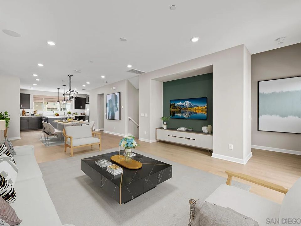 Discover the perfect blend of modern comfort and unbeatable convenience! This stunning 4-bed, 3.5 bath, three-story former model townhome is move-in ready with a fresh coat of interior paint, fresh carpeting throughout, kitchen and bath tile upgrades, a whole-house sound system, and upgraded patio pavers. The versatile floor plan features a highly desirable first-floor bedroom and full bathroom, perfect for guests, a home office, or multi-generational living. The main level offers a bright, open-concept space for relaxing and entertaining, while the upper floors offer a spacious private quarters. Your active lifestyle is right outside your door! You're just moments from the new Frontwave Arena, the William A. Wagner Aquatic Center, and the SoCal Sports Complex. Commuting is a breeze with easy access to the nearby train station and major freeway. Plus, you're just a short drive from Oceanside's beautiful beaches and iconic pier. With an attached two-car garage and a prime location, this home is an incredible opportunity. Note: Some Photos have been Virtually Staged.