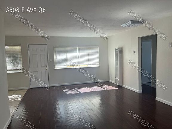 Welcome to 3508 E Ave Q6, a charming 2-bedroom, 1-bathroom home located in the vibrant city of Palmdale, CA. This home has been thoughtfully rehabbed and upgraded, featuring a fresh coat of paint throughout and a beautifully renovated bathroom. The open-concept living and dining area provides a spacious and inviting atmosphere, perfect for entertaining or simply relaxing at home. The kitchen boasts freshly painted cabinets and comes equipped with a stove. The home also features a swamp cooler and wall unit heater, ensuring comfort in every season. Outside, you'll find a fenced backyard, offering a private space for outdoor enjoyment. The property also includes a one-car garage and additional off-street parking for your convenience. Window coverings are included for added privacy and a small dog is welcome. Experience the perfect blend of comfort and convenience at 3508 E Ave Q6. Please make an appointment to view this unit through our website.