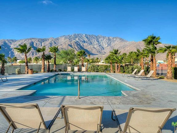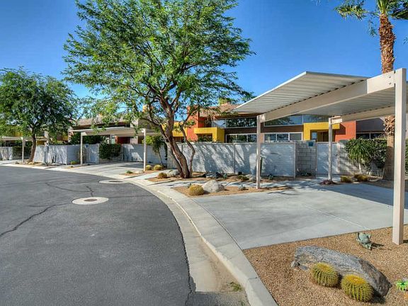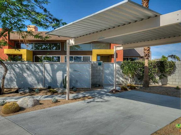 Immerse yourself in the impressive views from this contemporary end unit at the gated architectural community of Palermo. With ceilings soaring over 12 feet high, the space is given volume, and light flows in through both a wall of glass sliders and clerestory windows. Stained and sealed concrete flooring in the main living space adds to the modern ambiance. The galley kitchen is easy for cooks, with plenty of granite counter space, a gas range, and built-in microwave. A separate space can hold your in-home office or be used as a dining room. The Master Suite has access to one of the patios through glass sliders, and there's a roomy bath with a shower and oversized bathtub combo. A convenient powder room for guests is adjacent to the living room. Amenities here are fabulous, with 2 pools & spas, a nice gym, and a recreation room/clubhouse. It's a quick 5 minute drive to the bustling galleries and restaurants of the Uptown Design District or iconic Downtown Palm Springs.
