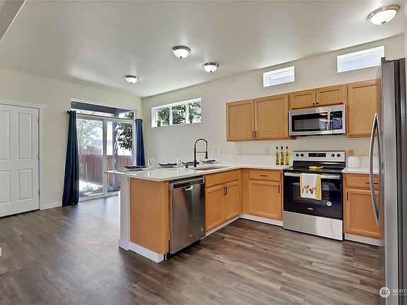 $30,000 in recent updates says you have nothing to do but move in! Tastefully updated with new waterproof vinyl plank flooring downstairs and bathrooms, carpet and 8 lb pad upstairs, interior trim, interior and exterior paint....even the front door. The kitchen is beautiful with new quartz counters and an eating bar, under-mount oversized stainless sink, and new stainless steel appliances. Black handles and pulls on the cabinets and gooseneck faucet pulls the design together. One bedroom on the main level with 2 living spaces and 3 bedrooms up. Sod has just been installed in the front and side play area and the back yard features river rock and plants/trees for minimal maintenance. Lastly, the central AC will keep you cool in the summer.