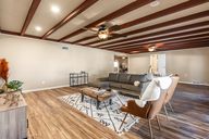 Spacious 5-bedroom, 3-bath home with two living areas, one with a cozy wood-burning fireplace, the other a step-down room with striking beam ceilings. The kitchen features appliances and a countertop with seating, perfect for casual meals or entertaining. Tile and LVP flooring, refrigerated air, and a laundry/mud room with a barn ...