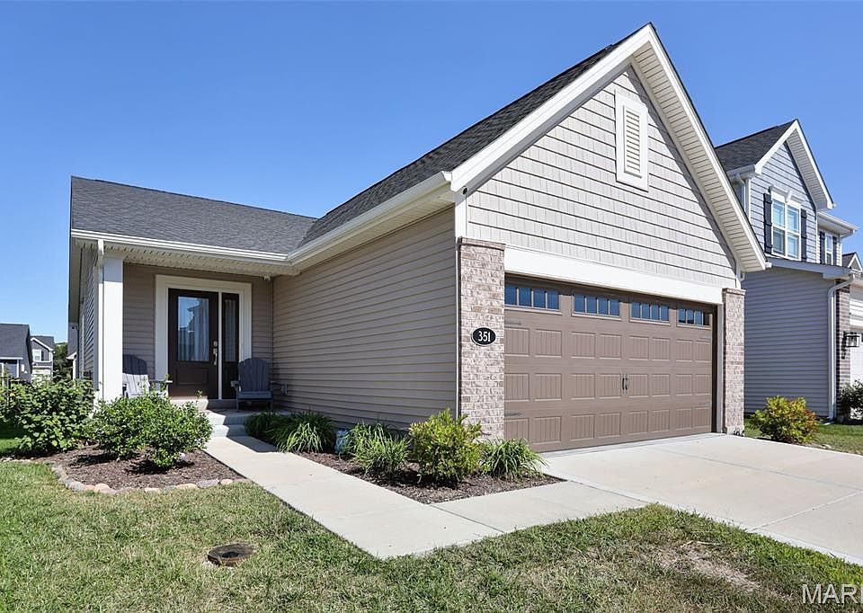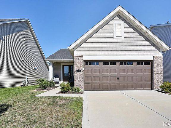 STUNNING Fischer & Frichtel Ashland Model with PREMIUM UPGRADES! This meticulously crafted home blends style with modern convenience-featuring nearly $60K in upgrades. The curb appeal stuns with brick accents, a covered front porch, and a stylish glass front door. Step inside to an open-concept living space with luxury flooring, perfect for everyday living and entertaining. The heart of the home is the designer kitchen-showcasing Quartz countertops, a farmhouse-style Quartz sink, tile backsplash, soft-close cabinetry with crown moulding, and pull-out base cabinet trays. A large kitchen island with raised bar and a built-in trash cabinet. The spacious primary suite offers a true retreat with a frameless glass marble shower featuring a built-in seat and shampoo cubbie, dual wave bowl sinks, and a sleek pocket door for added space and style. All bathrms include upgraded skirted trapway toilets and designer finishes. Energy-efficient includes blown spider insulation, R50 attic insulation, and all electric setup, tv/media jacks in bedrms. Additional features are 4-FOOT extended garage, sump pump and water softener. Enjoy the outdoors on your 16x30 expanded patio! Located in the desirable Windswept Farms community with access to over 15 acres of wooded common ground, two lakes, and a scenic trails - just minutes from Interstate 44 and everyday conveniences.