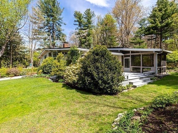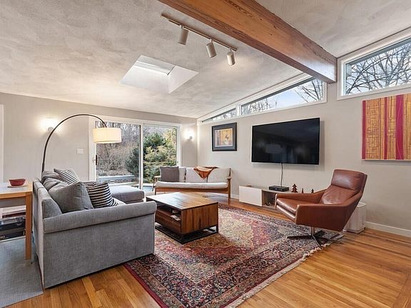 Set at the end of a woodsy cul-de-sac behind a row of trees is a distinctive mid-century modern home situated in a lush 3/4 acre oasis.The 1992 re-designed and expanded residence harmonizes with nature and its surroundings. The sun-filled open floor plan features a great room anchored by a massive fireplace and connects to a dramatic dining room and a private 375 sq.ft. deck. Glass walls, porch, endless skylights and soaring windows bring inside sunlight, energy and peaceful outdoor tranquility. It's a treat to cook and entertain in the fabulous custom kitchen with its big island, modern cabinets with tons of storage and amazing colorful garden views from a semi-circular wall of windows! Upper level offers brand new hardwood floor, three bedrooms, two new baths including a private en-suite with stunning woodsy views and a luxurious spa retreat to be enjoyed with the nature! The garden level features brand new floor, a family room, 4th bedroom and a stylish new bath. Welcome home!