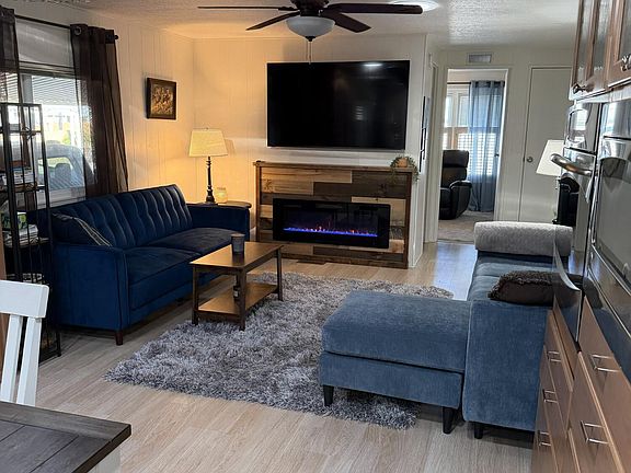 NOT YOUR ORDINARY MOBILE!! Extensively remodeled, this home has a modern, very comfortable feel to it. Beautiful wood custom kitchen cabinets and plenty of them. A large pantry with roll-out shelves, lots of soft closing drawers and high end stainless steel appliances. Luxury vinyl floors in the living area. Kitchen/living room set up in great room style with eating in kitchen. A lovely electric fireplace surrounded by wood sets the mood on cool nights. Skylights bring the natural light inside. 2 bedrooms (one on each side of the home)and 2 full bathrooms. Main suite has large walk-in shower. A private, full length porch on one side is perfect for entertaining and grilling. The porch on the carport side is also carpeted, private and cozy. Carport large enough for 2 cars.