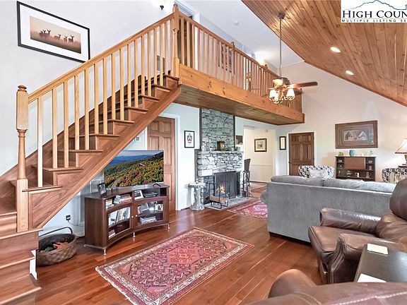 Discover the perfect blend of luxury and mountain charm in this gated Yonahlossee community, celebrated for its serene setting and premier amenities. This beautifully designed home offers four spacious bedrooms and three well-appointed bathrooms, thoughtfully arranged for both comfort and entertaining. The easy-access driveway provides ample parking and room to turn around. Enjoy breathtaking views of Grandfather Mountain and sweeping winter panoramas over Foscoe and Beech Mountain. Inside, vaulted tongue-and-groove ceilings and gleaming hardwood floors create a warm, inviting atmosphere. The great room’s impressive wood-burning stone fireplace anchors the space, making it the perfect gathering spot. The modern galley kitchen is equipped with stainless steel appliances, ideal for cooking enthusiasts. As part of the Yonahlossee Resort community (with a separate club membership), residents enjoy access to indoor and outdoor tennis courts, an indoor pool, fitness center, and clubhouse. Also, nearby hiking trails that showcase the area’s natural beauty. This home offers an exceptional opportunity for refined mountain living—whether as a full-time residence, a private retreat, or a short-term rental investment. 527 heated square feet are not counted, the ceiling height is just below 7'. Partial view of Grandfather Mountain in Spring/Summer and full view in late Fall/Winter.