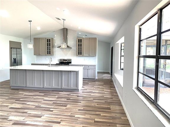 Welcome to this Beautifully UPDATED HOUSE! This home features 3 bedrooms, 2 bathrooms, 2 car garage, located on a large corner lot in a quiet neighborhood. As you enter the home through a covered porch, the laundry room will be on your right, and the hallway to your left leads to 2 bedrooms and family room/kitchen straight ahead! Totally an open floor plan with water proof vinyl flooring throughout, providing a smooth flow through the home. The updated kitchen offers all new stainless steel appliances, quartz counter tops, self closing cabinets, subway tile back splash, stainless hood, large island that has plenty of sitting space and storage, closet pantry with barndoor. Behind the kitchen you will find an additional living space that leads out the sliding glass doors to the covered screened lanai where you can sit with your morning coffee and enjoy the large backyard. The master bedroom is located off of the family room and has a large walk in closet and bathroom with standing shower. AC and water heater approx. 2 yrs old. This one is a MUST see for sure!!! Great location!