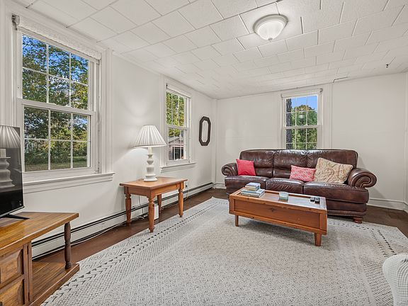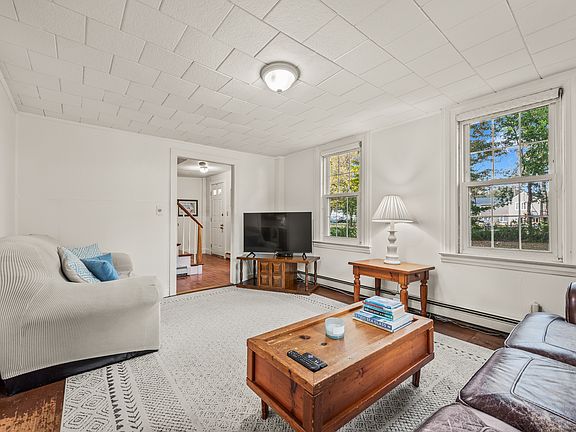 Tucked away off the road in historic Windsor, CT, this charming antique home sits gracefully on a private half-acre lot. Steeped in character, it features unique original wood flooring throughout most of the home, preserving its timeless appeal, with updated surfaces in the kitchen and baths for modern comfort. The spacious, eat-in kitchen offers an abundance of cabinets and generous counter space-perfect for everyday living or entertaining. A formal living room provides a welcoming space to relax, while the formal dining room showcases an impressive oversized original, decorative fireplace as its stunning focal point. Large windows fill the home with natural light, highlighting its warmth and classic details. Convenient first-floor laundry adds to the home's practicality. Step outside to an expansive composite deck off the kitchen, offering a peaceful retreat with plenty of privacy. With vinyl siding for easy maintenance, this distinctive property beautifully blends history, comfort, and seclusion-all within minutes of Windsor's historic center and Bradley International Airport. Easy access to highways! This home is being sold in as-is condition. Fireplace is decorative, non-working.