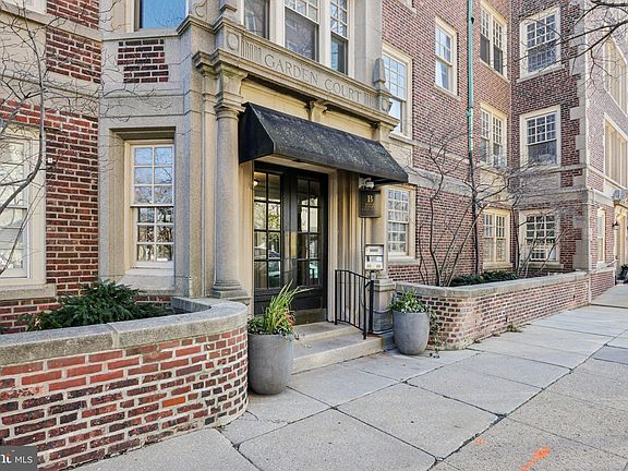 In West Philly's University City, the opportunity to buy a condominium the size of a house doesn’t come up very often, so take note! #B210 at Garden Court is now available, and at 1821 sf, it’s larger than most 2-story Philadelphia row houses. Its room-sized entry foyer leads to a large living room on the left and a big dining room or family room on the right, each with a full wall of windows. The current owner rehabbed the kitchen, adding granite countertops, sleek cabinets with whimsical handles, and high-end appliances (Fisher & Paykel fridge, Bosch DW). Pantry storage has been tucked into a previously awkward corner space. A small balcony off the kitchen provides access to fresh air, trash removal and the fire escape. There are 3 bedrooms, 2+1/2 updated original baths, a Bosch washer & dryer, ceiling fans and multiple huge walk-in closets. Many of the unit’s windows are recent energy-efficient historically appropriate wooden windows, as required by the building’s Philadelphia historic façade easement. Garden Court was designed by West Philadelphia developer Clarence Siegel in the 1920s in the gracious “pre-war” style which includes oversized bay windows, decorative fireplaces and hardwood flooring. Its classic bathrooms feature leaded glass windows, ceramic tile floors and Vitrolite glass walls. When it was built, the complex was offered as a 6-story luxury apartment development for residents who didn’t want the hassle of taking care of a house. Converted to condos in 1994, it still fills that hassle-free housing spot today. Condo amenities include a glamorous indoor year-round swimming pool, exercise room, library, meeting room, indoor bike storage, and outdoor space with fountains and koi ponds in two gated courtyards. The location is just six blocks west of the University of Pennsylvania and close to public transportation, nearby restaurants and coffee shops.
