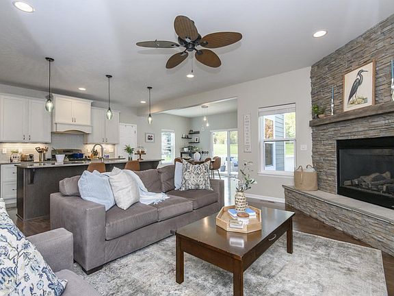 Exposed lower levelFamily roomOpen concept floor planSubdivision walking pathKitchen and dining areasFloor to ceiling fireplaceLuxury ensuite bath