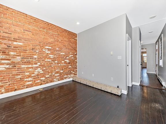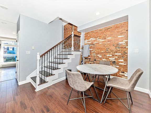 Step into this stunning home featuring upscale renovations throughout. The kitchen boasts custom cabinetry, granite countertops, and stainless steel appliances, perfect for cooking and entertaining. The inviting living room showcases exposed brick walls and a charming iron staircase leading to the upper level.