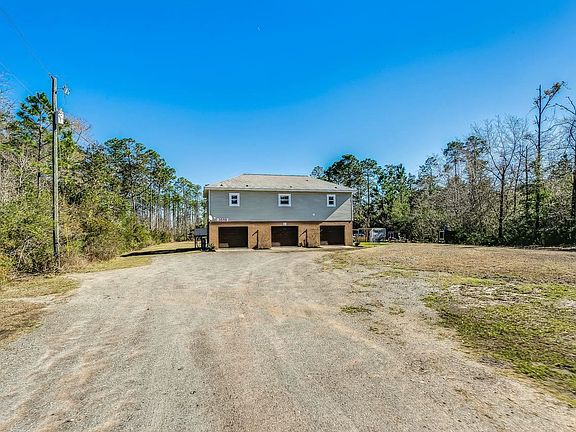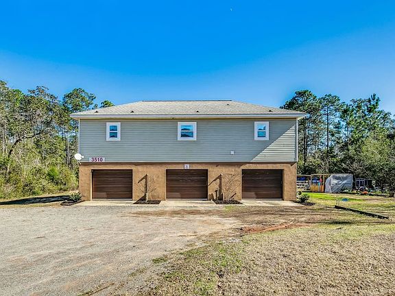 This ready to move in two-story home was built above an oversized 3 car garage and is nestled on 1 acre lot with an easement all the way to Blackwater Bay. Inside this custom home you have an open concept layout with the two bedrooms on opposites sides and each has its own bathroom; The great room and kitchen are at the center of the home with wood laminate flooring. The bedrooms have carpet flooring, crown molding, ceiling fans and sliding doors that lead you to private balconies. The bathrooms have tile floors, tile showers and vanities. The kitchen is fully equipped with stainless appliances including dishwasher, electric stove, microwave and fridge. It also has a large breakfast bar with granite counters that opens to the great room. From the great room you have access to the larger covered balcony from where you can enjoy the gorgeous views of the blackwater bay. New HVAC was installed in 2022, Full home generator, Brinks alarm security with CCTV system, Solar powered electric fence upfront (for your dogs or chickens), 50amp in garage and outside for your RV and a new roof will be installed before closing. Great fit for all snowbirds looking for that perfect spot during winter, good fit for an Airbnb or for your everyday living as it can feel like your perfect retreat. About 100 ft from the road to the house for additional privacy. The location is close to I -10, close to a boat launch and about 35min from the beautiful white sand beaches of Navarre beach. Survey available. Schedule your personal appointment today.