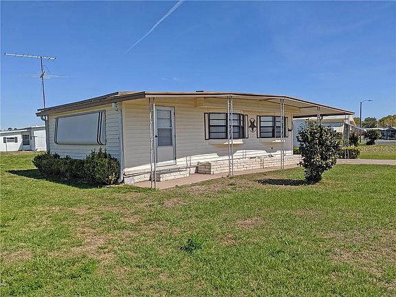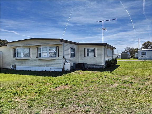FINALLY! This is the WELL-MAINTAINED Florida home you've been scouring the internet for! This home is FULLY FURNISHED and has been updated with medium oak LAMINATE FLOORING and a NEW MEMBRANE ROOF that was installed in 2019. Come home and pull into your EXTRA LONG DRIVE with a covered carport. Upon entering the home you'll find a TILED KITCHEN with plenty of cabinets and the BUILT-IN MICROWAVE adds to the great amount of countertop space. The dining area by the bay window is a comfortable space with a great front view where you can enjoy your morning coffee or that delicious lasagna dinner ordered from Sergio's, right next to the community. The living room also features a bay window and is furnished with a wall mounted FLAT SCREEN TV for even more space savings. Enjoy the finished FLORIDA ROOM for additional entertaining space or convert it into a craft room or library. The full bath has a beautifully tiled vanity and fully tiled WALK-IN SHOWER. Both of the bedrooms also have bay windows. The property includes additional storage with a small shed in the backyard. This home sits on a SPACIOUS LOT in ZEPHYR SHORE ESTATES, and YOU OWN THE LAND here! NO LOT RENT and a LOW HOA fee makes this very affordable Florida living. Ready for the best part? You are just a few steps away from the wonderful amenities center. Grab your beach towel and just walk across the street, and you're at the beautifully maintained COMMUNITY POOL AND CLUBHOUSE. This one is the one! Come check it out before it's gone!