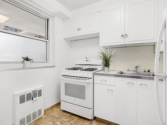 On the fifth floor, this apartment gets amazing light and has a twenty foot terrace. The apartment enters into a dining area, and just beyond, there’s a sunny kitchen with metal cabinets and retro formica counter in great original condition. It’s a piece of history! A king sized bedroom and a charming tiled bathroom make for a great layout. The original linoleum floors are under the carpet. Low monthly maintenance of $735 includes all utilities. The community is 100% owner occupied and subletting is not permitted.