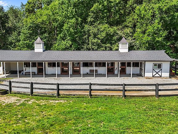 Luxury Equestrian Mini-Farm on Nearly 9 Acres! Thoughtfully designed for both comfort and functionality, this beautifully maintained 3-bed, 3-bath home offers open-concept living with hardwood and tile floors, rich cabinetry, and stainless steel appliances. Enjoy pastoral views of fenced pastures, the pond, and barn right from your living room. The 5-stall shedrow barn features a tack room, hay/grain storage, wash stall with hot water, and matching roof with cupolas. Ride in the arena or relax knowing your horses are secure in well-laid-out pastures with no-climb and 3-board fencing. A tractor shed, automated gated entrance, and wired security system add to the property's practicality. The finished walk-out basement, completed in 2019, includes a large bedroom, full bath, mudroom with granite counters and sink, and a spacious flex area ideal for a gym, rec room, or in-law suite. Additional upgrades include a whole-house generator, new well system, water heater, and high-speed internet. This turnkey property blends luxury living with true equestrian lifestyle.