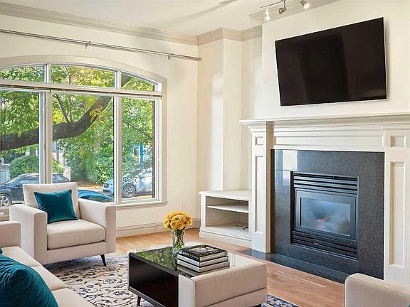 Red brick townhouseSleek gourmet kitchenGranite countertopsOversized islandStainless steel appliancesGas stoveLuxurious master retreat