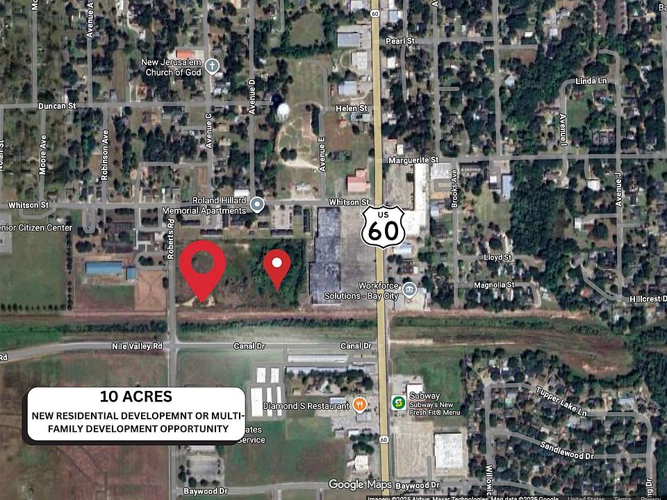 The property features level, mostly cleared terrain with easy access to main thoroughfares, providing convenient connectivity to Highway 35, Highway 60, and nearby downtown Bay City. With ample frontage along Roberts Road, the site offers great visibility and accessibility for potential retail, warehouse, or mixed-use development.