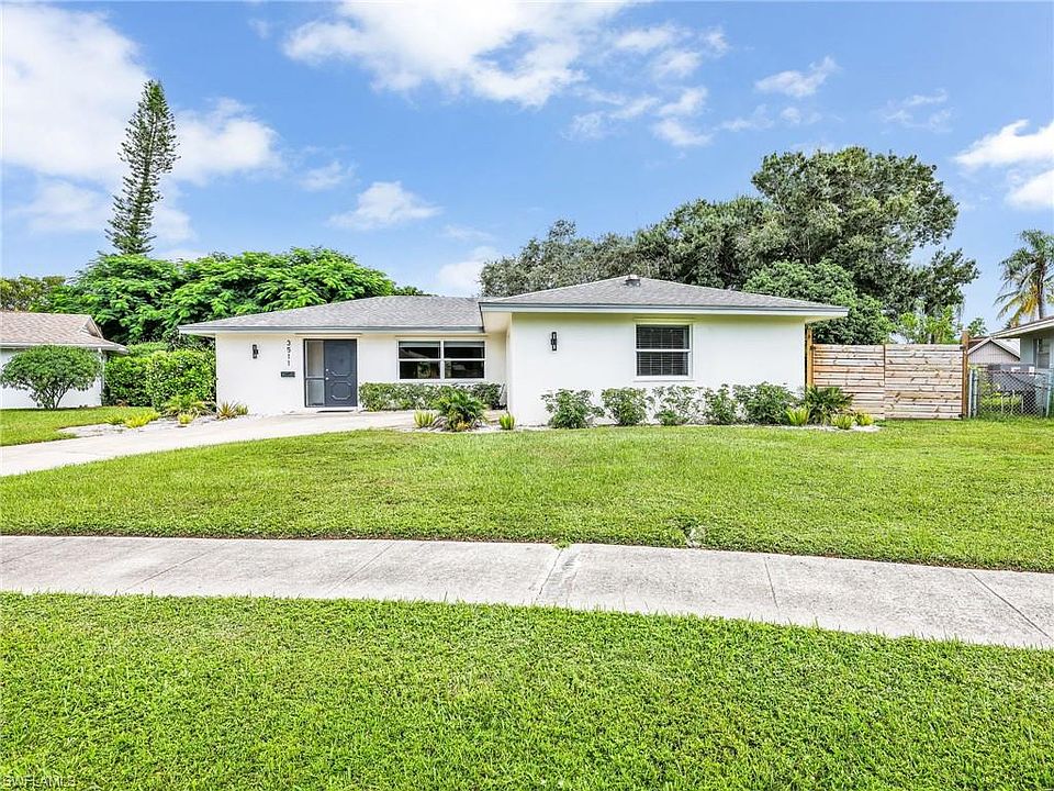 LIKE NEW – Fully Renovated and Move-In Ready! No detail was overlooked in this complete interior transformation. The home features new luxury vinyl plank flooring with updated baseboards, a freshly painted interior and exterior, and modern quartz countertops with custom cabinetry in both the kitchen and bathrooms. Bathrooms showcase beautiful new tile showers with frameless glass enclosures, complemented by upgraded fixtures, hardware, and lighting throughout. Additional enhancements include new window coverings, 2022 kitchen appliances, 2022 washer and dryer, A/C system, and beautiful landscaping for added curb appeal. This fenced property offers a rare opportunity for pool, extra space and storage, featuring a beautiful covered pergola to enjoy BBQ with family and friends, 8' x 8' tool shed, and impact windows plus hurricane shutters for storage structures. The roof was replaced in 2017, ensuring peace of mind for years to come. Located in Poinciana Village, a centrally positioned community with no HOA restrictions, residents enjoy proximity to everything Naples has to offer. You're just 10 minutes to Clam Pass Beach and SeaGate Beach, and less than 15 minutes to the historic 5th Avenue South and 3rd Street South shopping, dining, and entertainment districts. The community also features a park with a playground, basketball court, and tennis courts, adding to the appeal of this exceptional property.