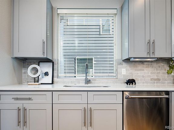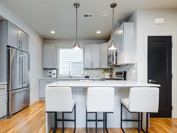 An urban stunner in Denver's Sloans Lake Neighborhood. This modern, multi-level townhome shines with its rooftop patio, attached two-car garage and contemporary finishes. On the first-floor, a favorable home office and half-bath are anchored by stairs climbing to the second-story where hardwood floors line an open-floor plan with kitchen, living room, dining room and another half-bath. The kitchen’s coveted full pantry, sleek stainless steel appliances, and breakfast bar with waterfall countertop bask in the light provided by the living room’s high ceilings and sliding-glass door to a large, 136-sq-ft balcony. Secluded on the third-floor, the primary suite is paired with dual-closets (one of them being a generous walk-in) and a chic ensuite full-bath with great counter space and storage. Continuing down the hallway is a laundry closet, sizable full-bath, and a spacious secondary bedroom large enough to fit a bed and small desk. The expansive rooftop deck is an awesome place to entertain offering water and gas hookups, and views of Downtown Denver and the mountains to the west. Beloved neighborhood restaurants, breweries, coffee shops and more are all nearby, including Odell's, The Patio, Sloans Tap and Burger, Gusto and Alamo Draft House to name a few. Downtown hot spots, including Empower Field and Ball Arena, are less than 10 minutes away.